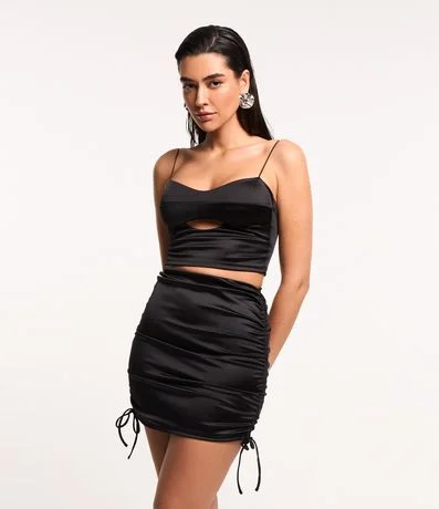 Saia curta, com franzidinho e amarração na lateral e sem estampa.