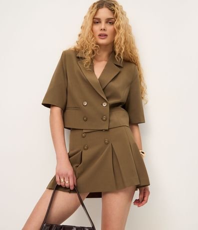 Ref: Saia curta feminina confeccionada em viscose certificada. Possui modelagem estruturada, apresentando pregas frontais, cintura reta e aplicação de botões decorativos alinhados em duas fileiras, inspirados no estilo alfaiataria.