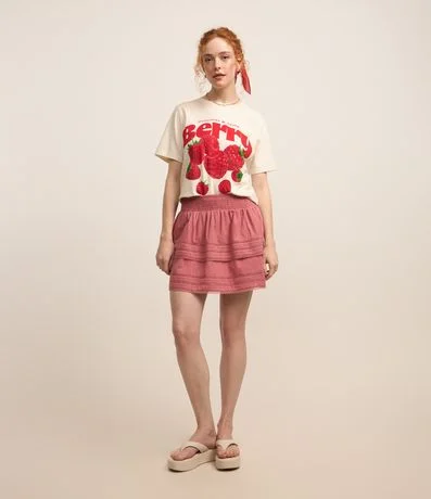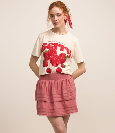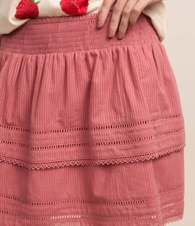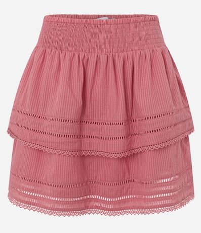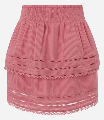 Saia curta com cós largo de elástico, babados com entremeios e confeccionada em cambraia.