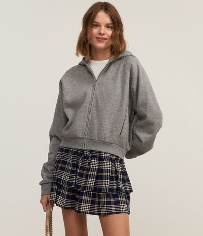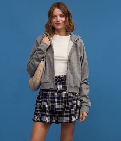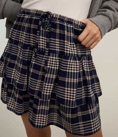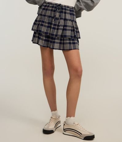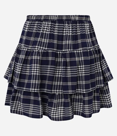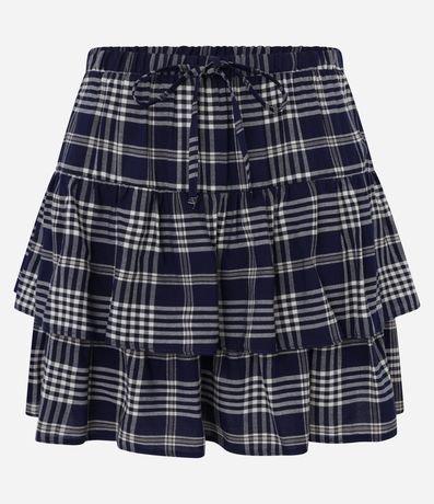 Ref: Saia curta confeccionada em chalis, com cós elástico e cordinha para ajustes. Peça com estampa xadrez e barra dupla com babados.
