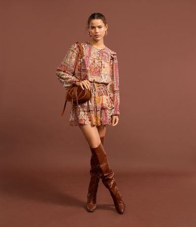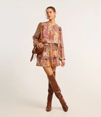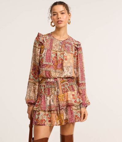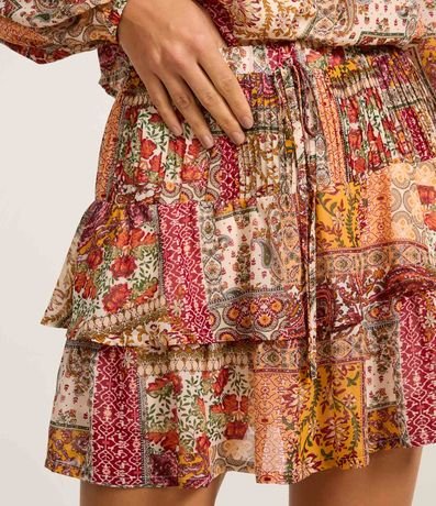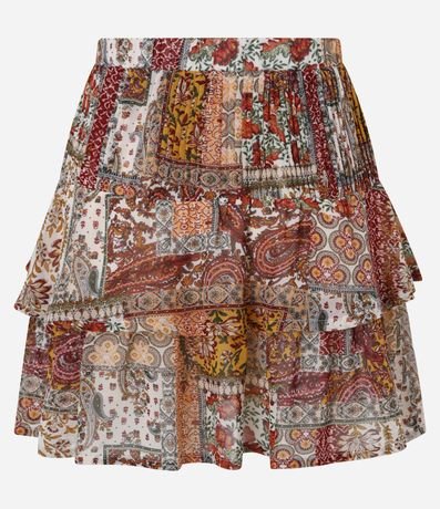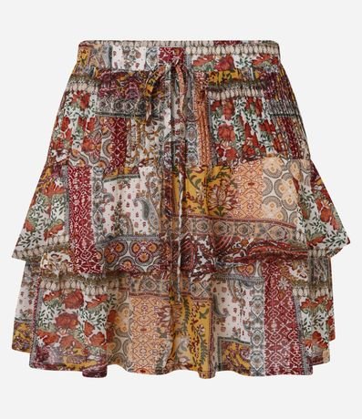 Ref: Saia curtinha com babados, confeccionada em chiffon com cordão para ajuste no cós e estampa em repetição mix de patch.