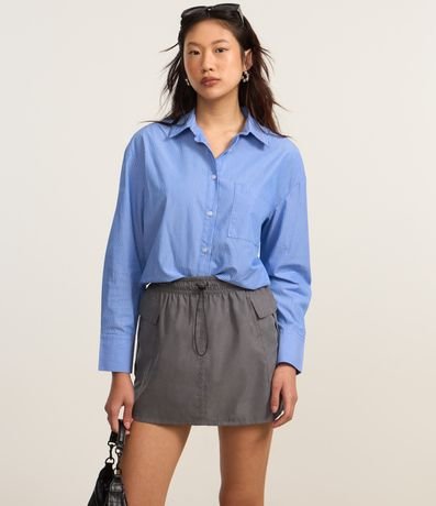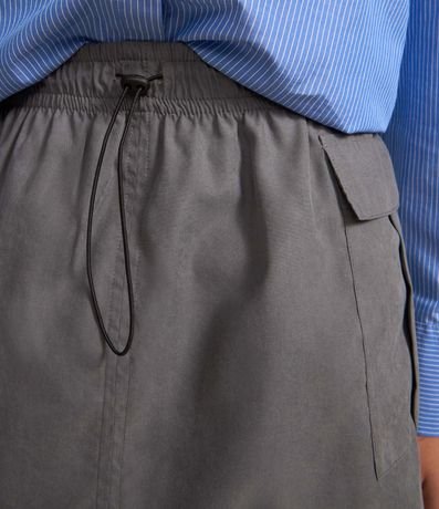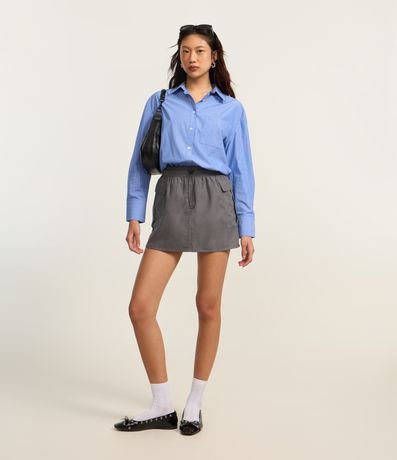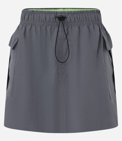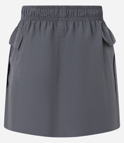 Ref: Saia curta confeccionada em cupro com regulador no cós elástico, sem estampa e com bolsos nas laterais.