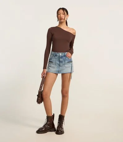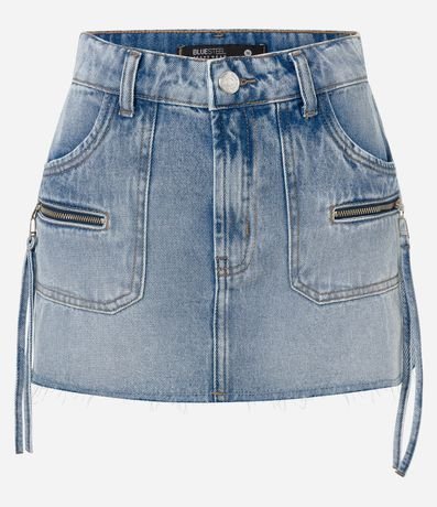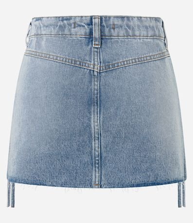 Minisaia confeccionada em jeans com algodão bci mais sustentável, bolsos carpinteiro com zíper e fitilho, barra desfiada e sem estampa.