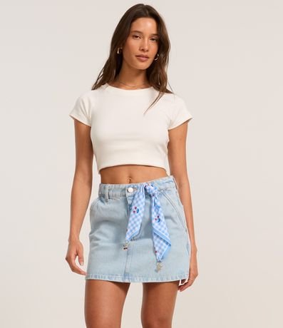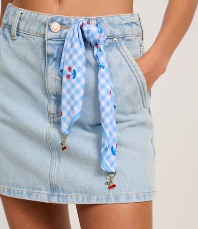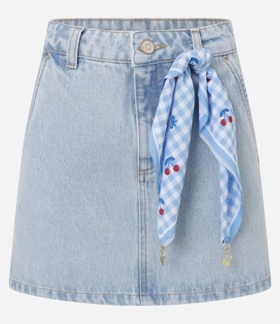 Ref: Saia curta confeccionada em jeans com algodão bci mais sustentável, cintura alta com lencinho de frutas no passante e produzido em boas práticas ambientais.