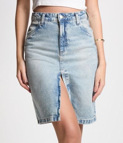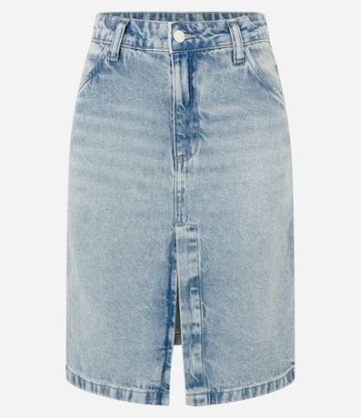 Saia com comprimento acima dos joelhos confeccionada em jeans com passantes na cintura, bolsos e fenda central. Possui lavagem de efeito dirty washed.