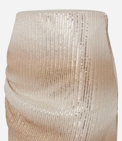 Saia feminina curta em paetê metalizado transpassada, fechamento lateral por zíper.