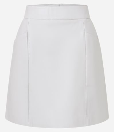 Saia reta curta confeccionada em PU com recortes e pences com fechamento traseiro por zíper.