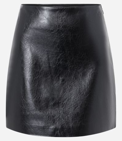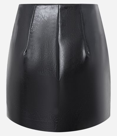Saia curta, justinha com fechamento por zíper invisível na lateral, confeccionada em material sintético, pu, e textura.