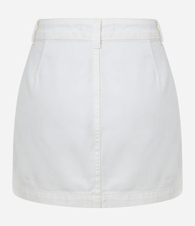 Saia curta confeccionada em sarja, bolsos faca nas laterais, puídos com paetês e sem estampas.
