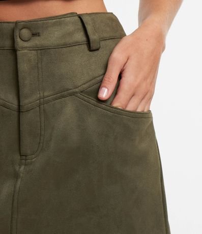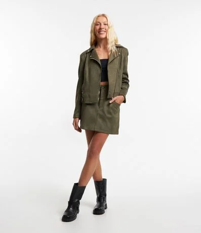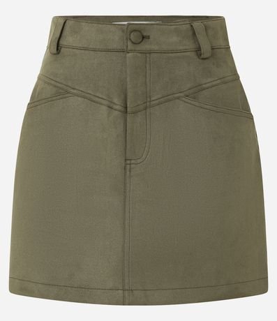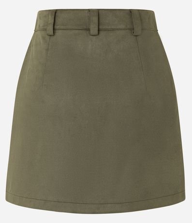 Ref: Saia feminina de modelo curto, confeccionada em suede, com cós fixo, recortes e fechamento frontal tradicional, com botões e zíper.