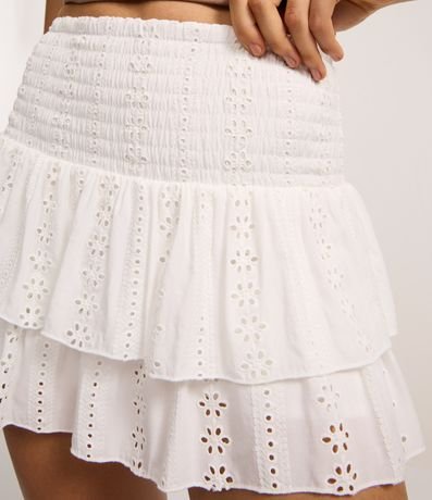 Ref: Saia feminina confeccionada em viscose certificada, curta com cós em lastex, babadinhos e textura.