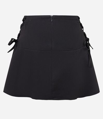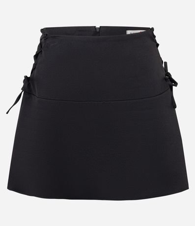 Ref: Saia feminina evasê curta alfaiatada com cós fixo e detalhes de lacinho lateral de amarração.