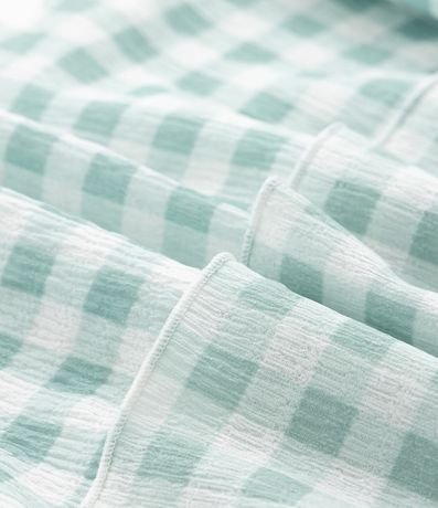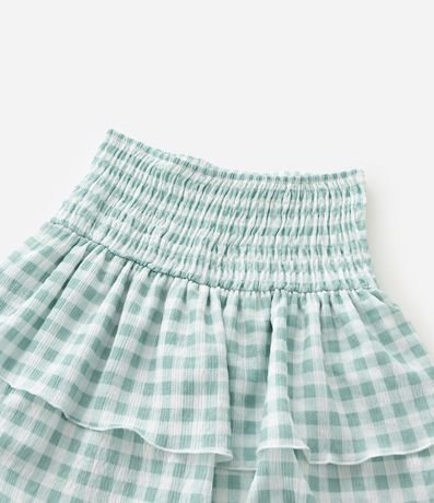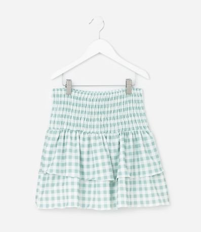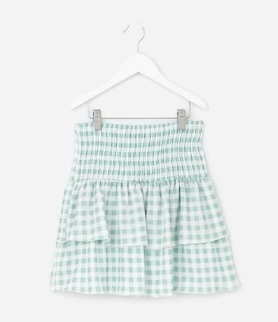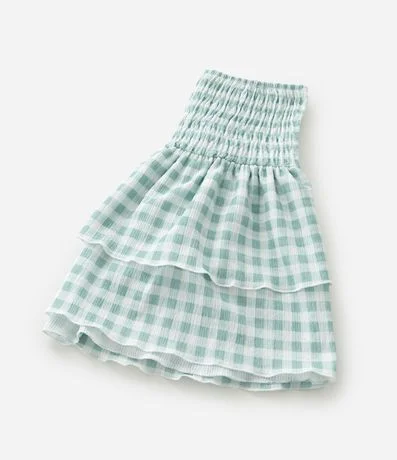 Ref: Saia infantil confeccionada em anarruga através de boas práticas ambientais, no modelo curto. Possui cós em lastex, babadinhos e estampa xadrez vichy.