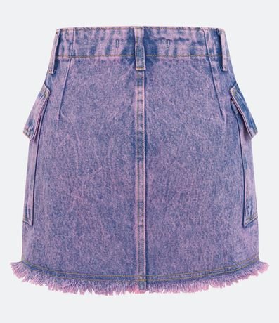 Saia curta em jeans com passantes no cós, botão único e bolso cargo.