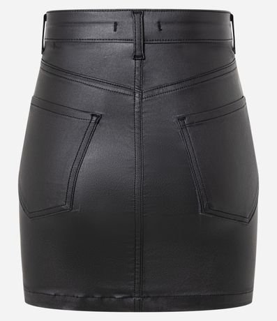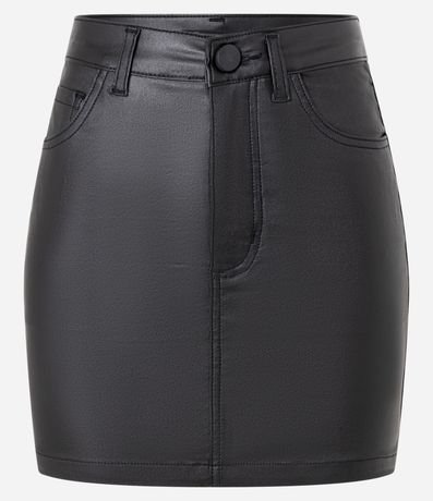 Ref: Saia curta com cintura alta, confeccionada em jeans resinado e algodão bci mais sustentável, bolsos frente e costas e produzida através de baixo consumo de água.