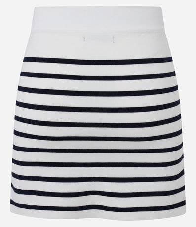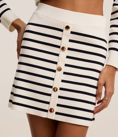 Ref: Saia curta de tricô com botões metalizados e listras horizontais. Este produto possui viscose certificada em sua composição, sendo ambientalmente mais responsável.