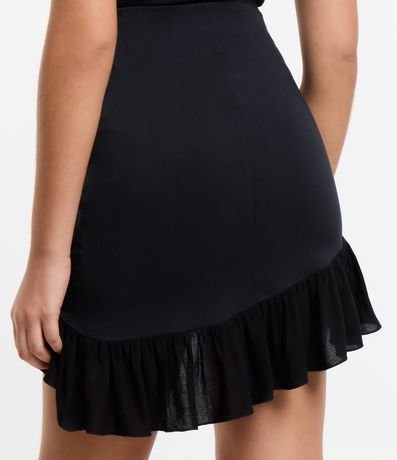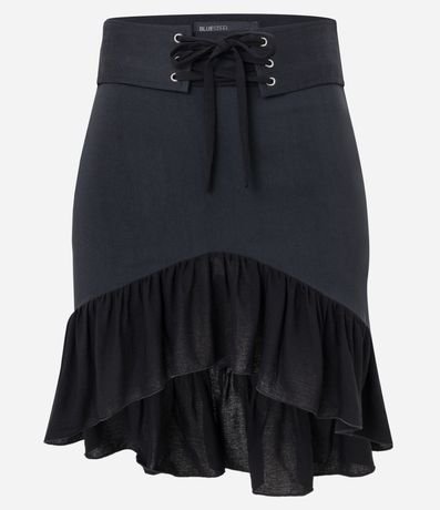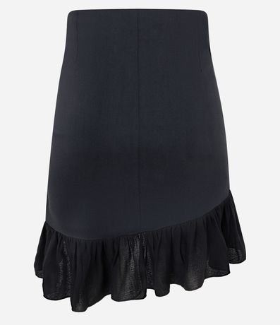 Ref: Saia curta confeccionada em bengaline, com amarração frontal no cós e barra assimétrica com babado.