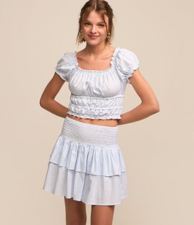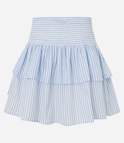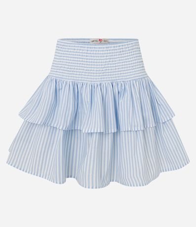 Ref: Saia feminina, confeccionada em tricoline, com cós largo, lastex para ajuste, babados em camada e estampa listrada.