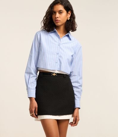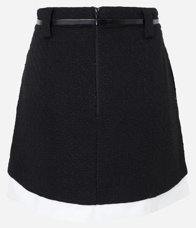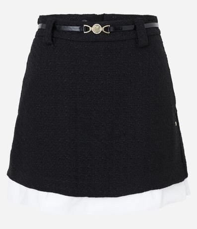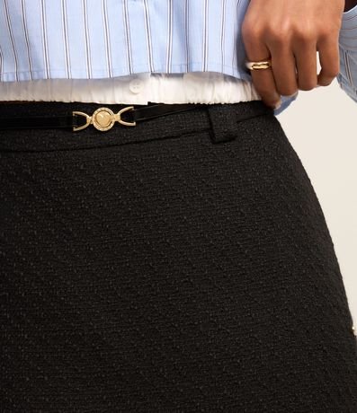 Ref: Saia de comprimento acima dos joelhos, confeccionada em tweed, com passantes na cintura e barra subposta com detalhe de tricoline. Inclui cinto fino com fivela em formato de coraçãozinho com pedrarias de strass brilhantes.