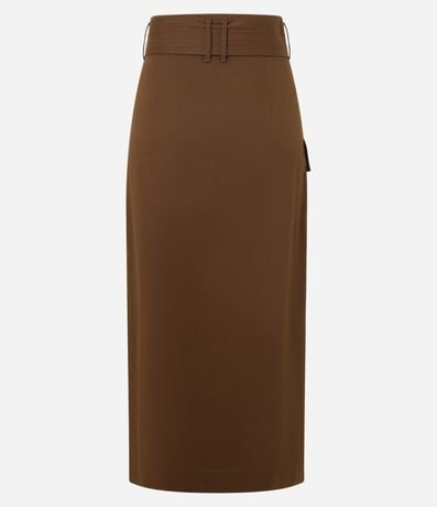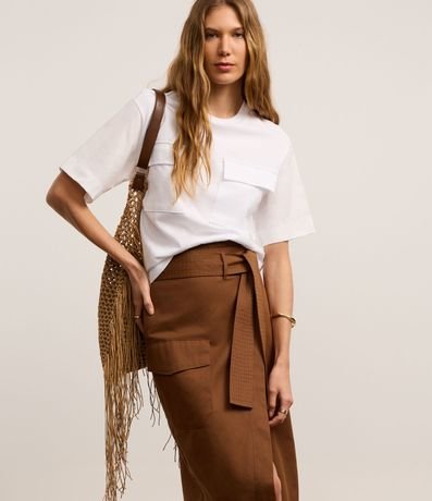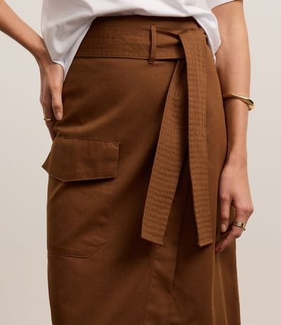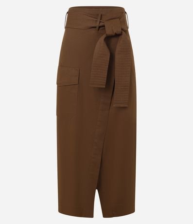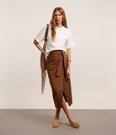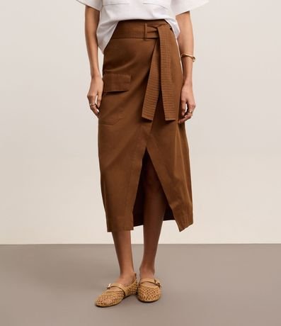 Ref: Saia envelope, evasê confeccionada em sarja com algodão bci mais sustentável, cinto faixa com amarração na cintura, bolso cargo com lapela e fenda frontal.