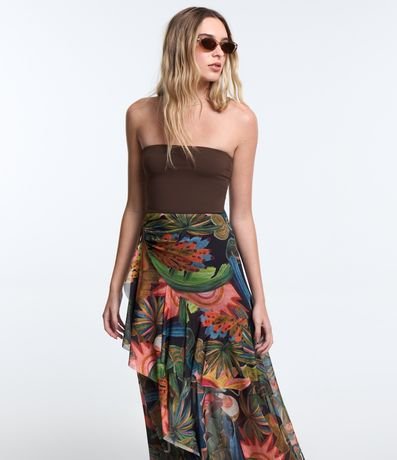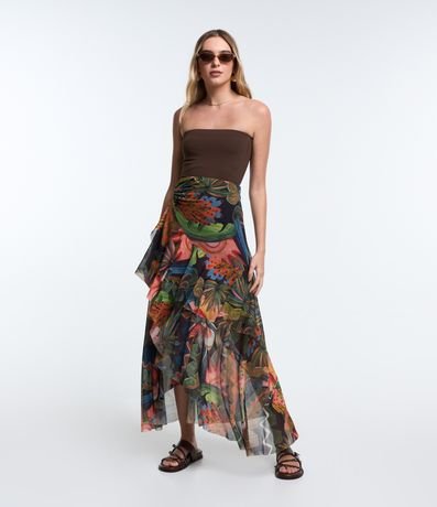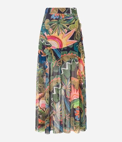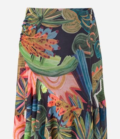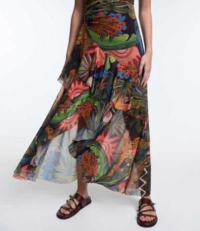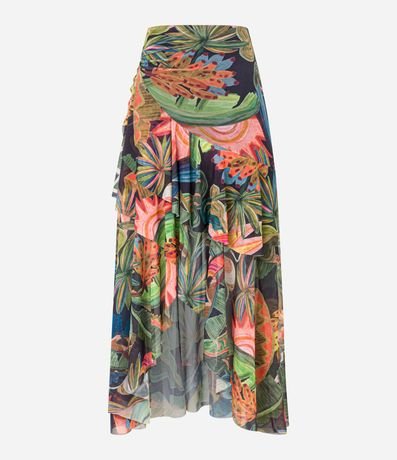 Saia evasê confeccionado em tule, estampa tropical com babado assimétrico e franzido lateral.