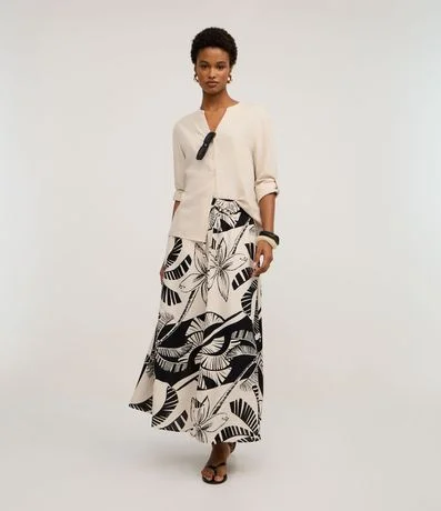 Saia Evasê em Viscolinho com Estampa Coqueiro e Folhagens
