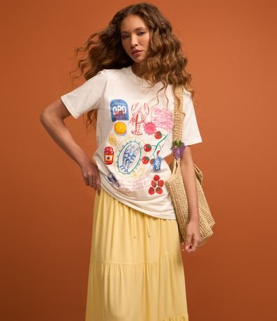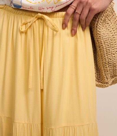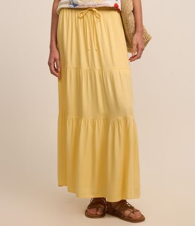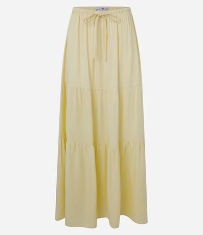 Ref: Saia feminina confeccionada em viscose, modelo evasê com cós elástico, cordão para ajustes e babados.
