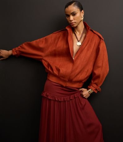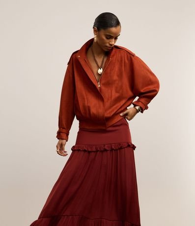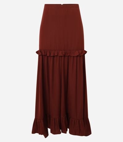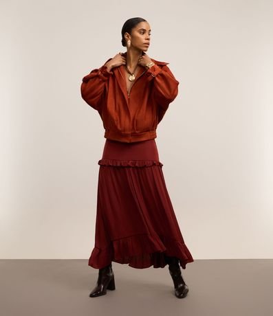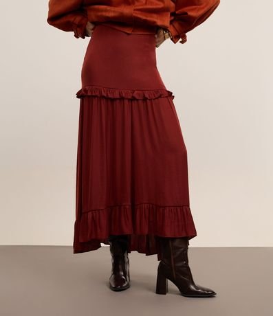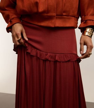 Ref: Saia com efeito acetinado, modelo evasê de comprimento midi, com fechamento detrás com zíper discreto. A peça tem recorte com babado abaixo do quadril e recorte franzido na barra.
