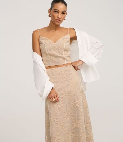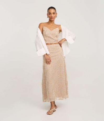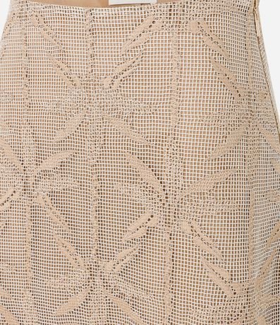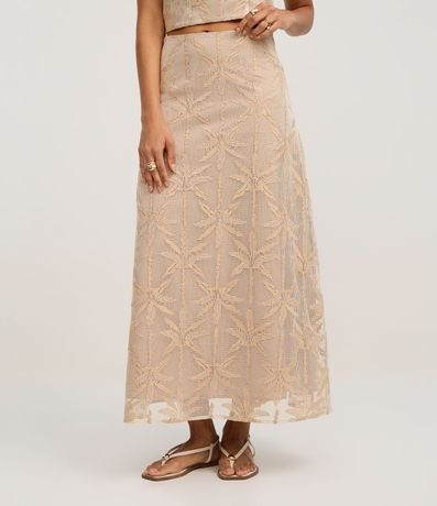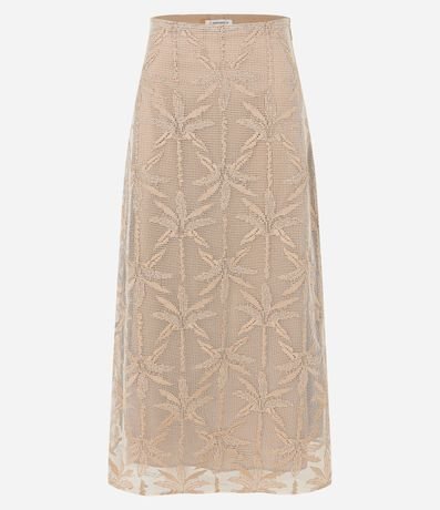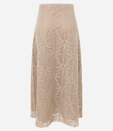 Ref: Saia evasê midi, confeccionada com malha com ponto aberto, com fechamento lateral por zíper e bordados de folhagens.