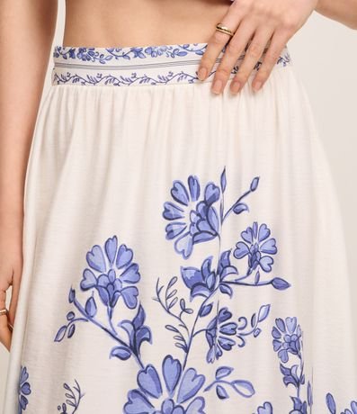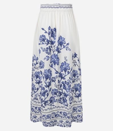 Saia evasê midi, confeccionado em viscose, com elástico na cintura. A peça tem estamparia de flores que remetem às ilustrações de azulejos lusitanos. Este produto possui viscose certificada em sua composição, além de ter sido produzido através de processos mais sustentáveis com boas práticas ambientais, sendo ambientalmente mais responsável.