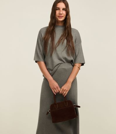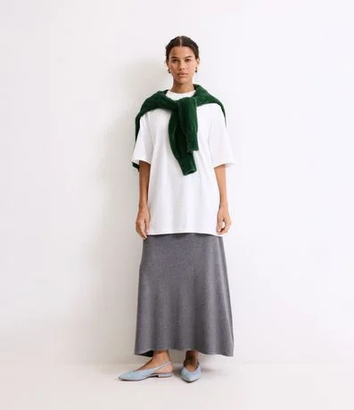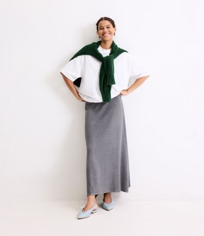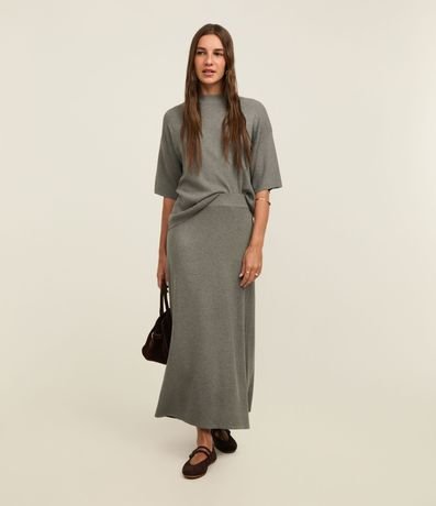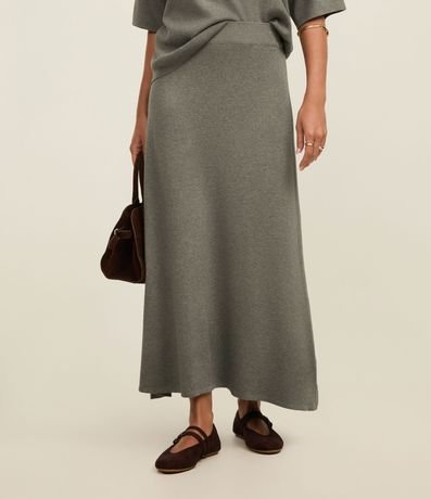 Saia evasê de comprimento midi, confeccionada em tricô com viscose mais sustentável, com elástico na cintura. Peça tem caimento leve e elástico na cintura.