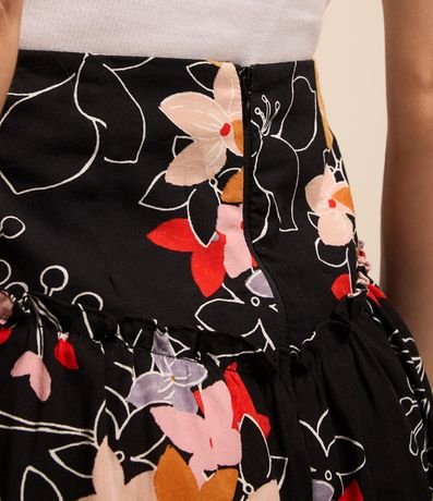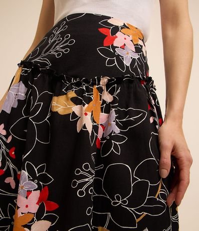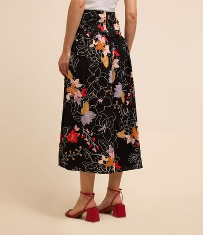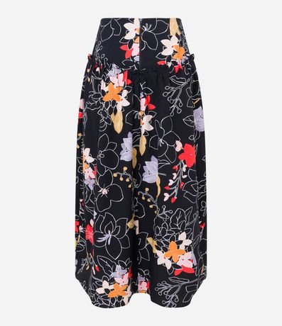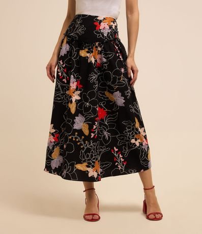 Ref: Saia evasê midi confeccionada em tricoline com cós largo com recorte de frufrus além de estamparia de flores contornadas com contrastes coloridos.
