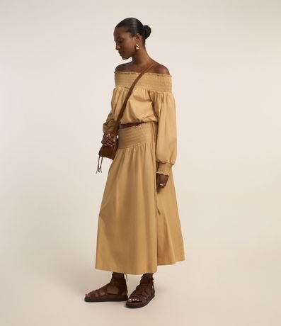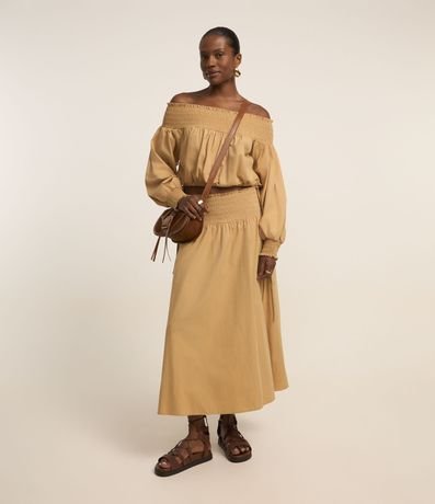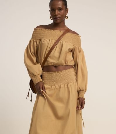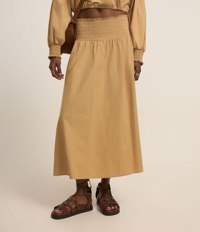 Ref: Saia evasê midi confeccionada em tricoline com cós lastex e pala larga.