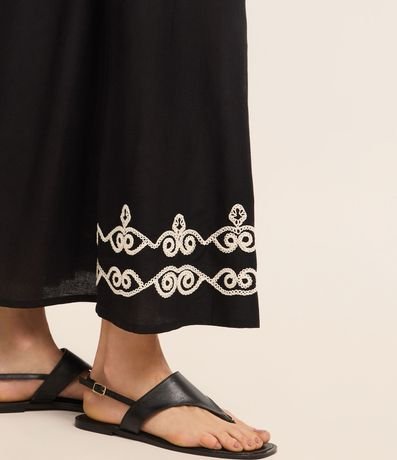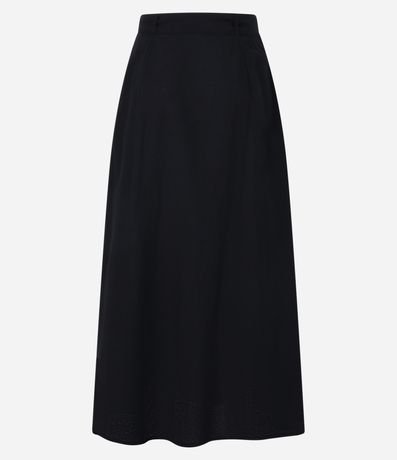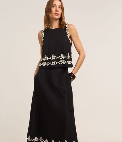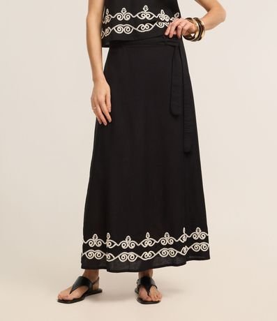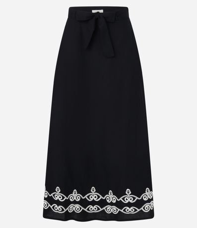 Ref: Saia evasê midi, confeccionada em viscolinho, com elástico no cós, faixa para amarração e bordado na barra. Este produto possui viscose certificada em sua composição, sendo ambientalmente mais responsável.