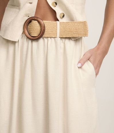 Saia evasê midi confeccionada em viscolinho com passantes e cinto de elástico. O cinto possui aspecto semelhante a palha além de fivela de argola d madeira.
