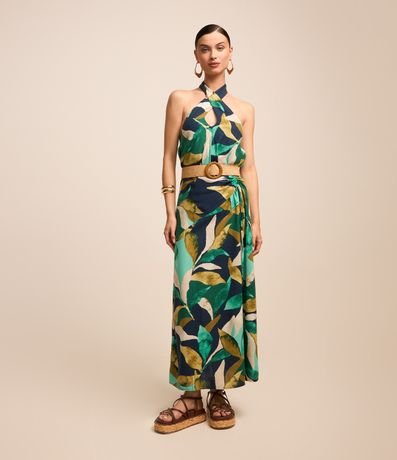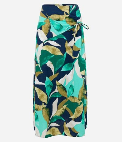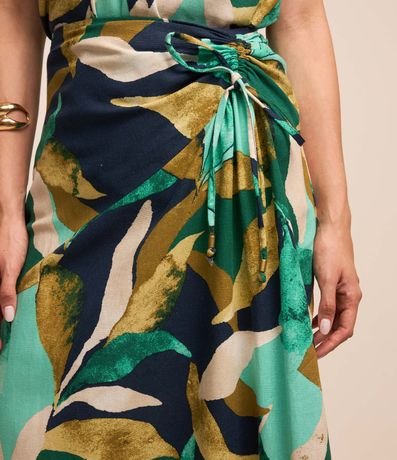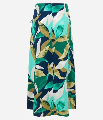 Ref: Saia evasê midi confeccionada em viscolinho com amarração com franzido lateral. Possui estampa de folhagem.