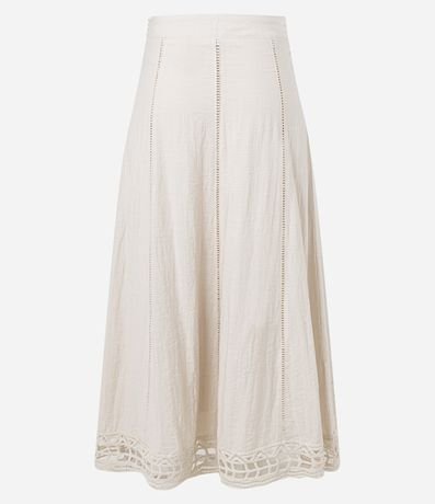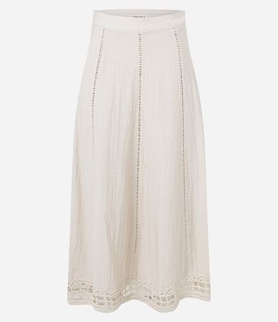 Saia evasê midi, confeccionada em viscose, com recortes de entremeios e bordado na barra. Este produto possui material mais sustentável em sua composição, sendo ambientalmente mais responsável.
