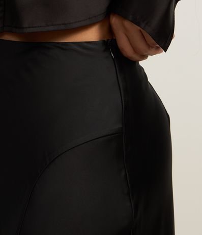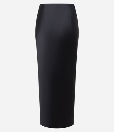 Saia evasê, new midi com cós elástico, textura acetinada e com fenda frontal.