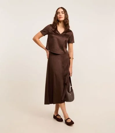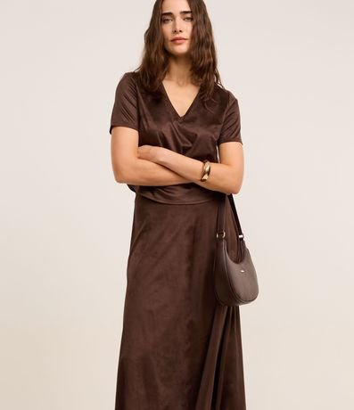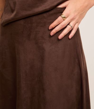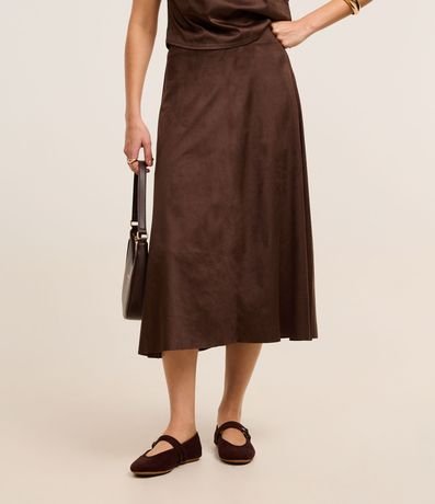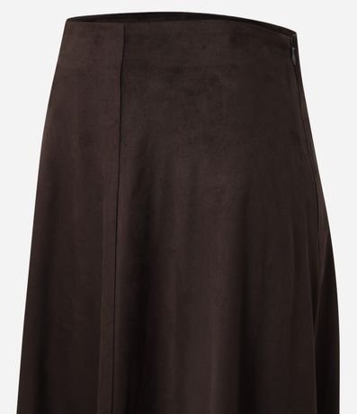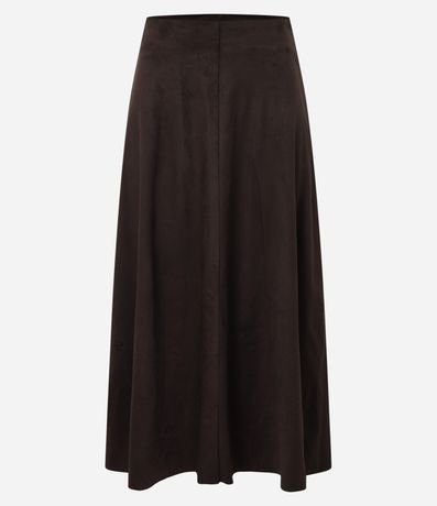 Ref: Saia feminina de modelo evasê, comprimento new midi, cofeccionada em suede, com cós fixo e sem estampa. Possui recortes, cintura alta e fechamento lateral com zíper.