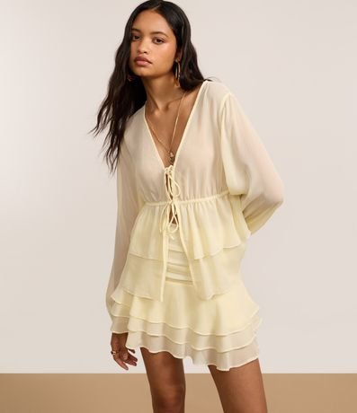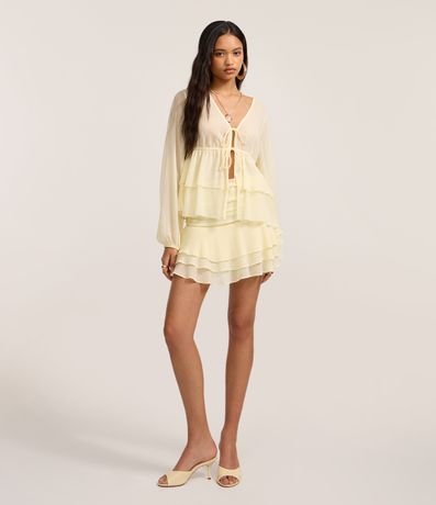 Saia godê curta, confeccionada em chiffon, com franzidos na pala e babados sobrepostos na barra. Peça com forro.