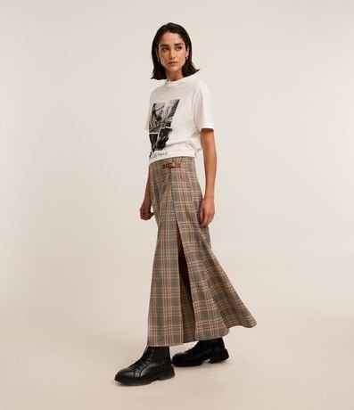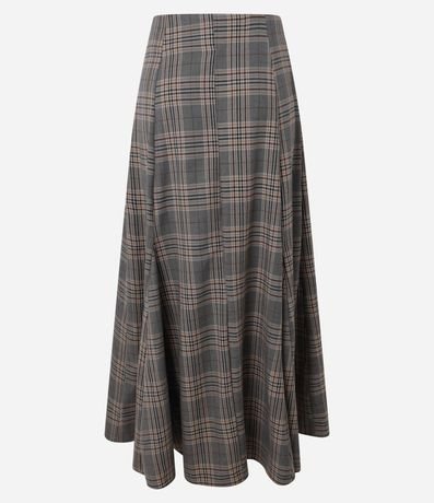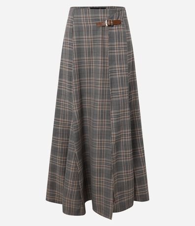 Ref: Saia longa, godê com cintinho em courino com fivela na lateral, estampa xadrez e com pregas.