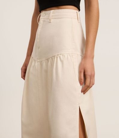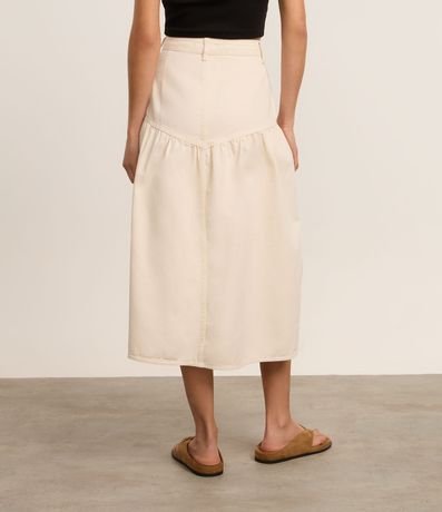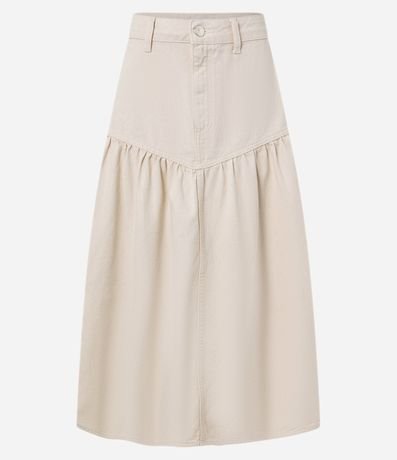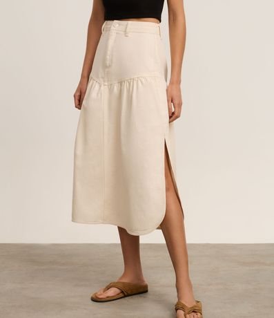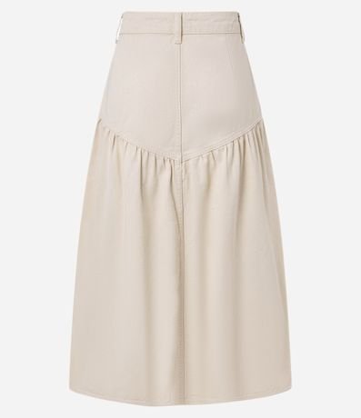 Saia godê confeccionada em sarja de algodão mais sustentável. A peça tem comprimento new midi, passantes na cintura e recorte V.