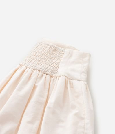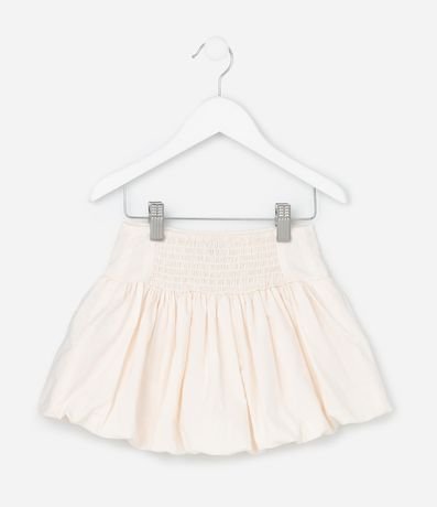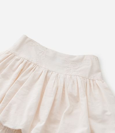 Saia infantil confeccionada em tricoline mais sustentável, no modelo balonê. Possui cós elástico, pregas e estampa bordada, floral.