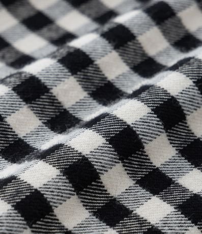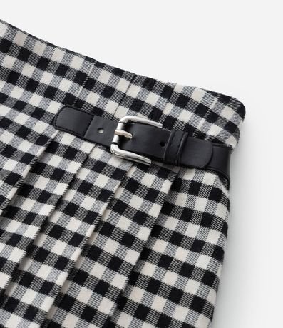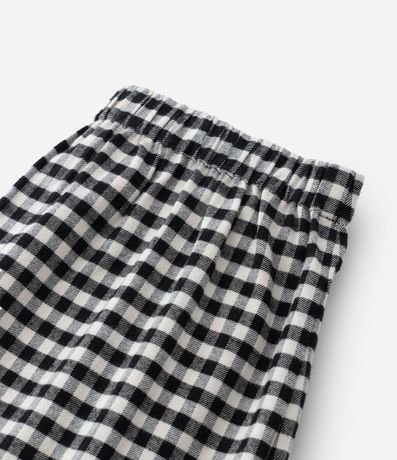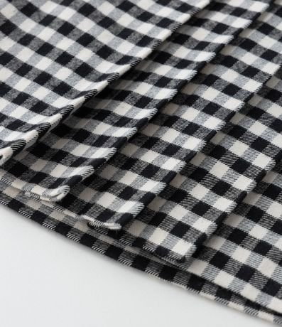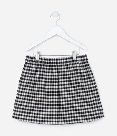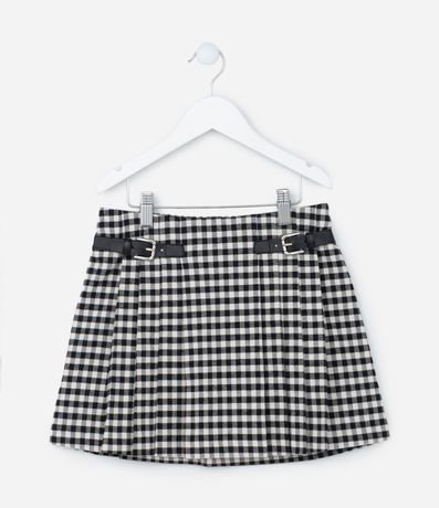Ref: Saia infantil com corte alfaiatado, cós elástico, cintos laterais com fivela, preguinhas e estampa xadrez.