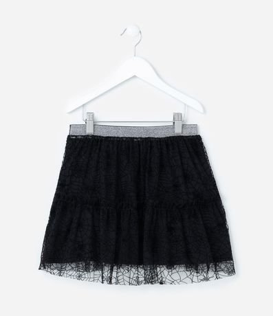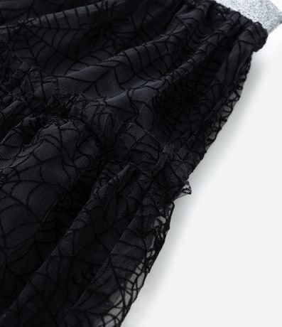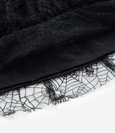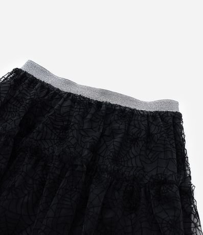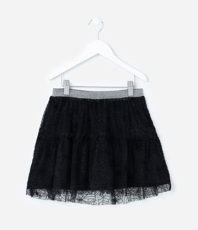 Ref: Saia infantil curtinha, confeccionada em tule, com elástico no cós e forro. A sainha tem textura que formam o efeito de teias de aranhas, tornando à peça perfeita para festas temáticas como o Halloween.