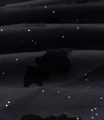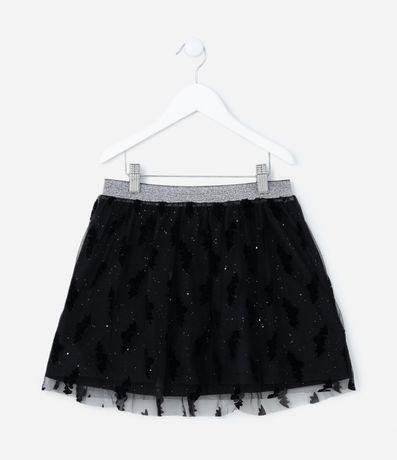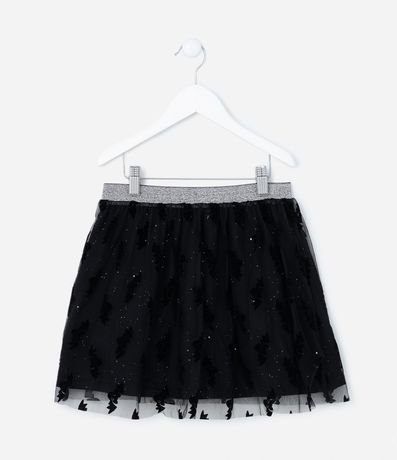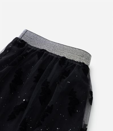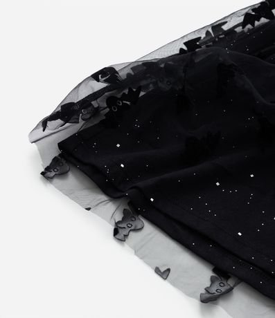 Ref: Saia infantil em tule com forrinho, cós em glitter metalizado, brilhos e morceguinhos aplicados.