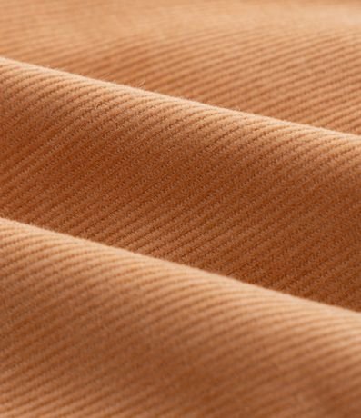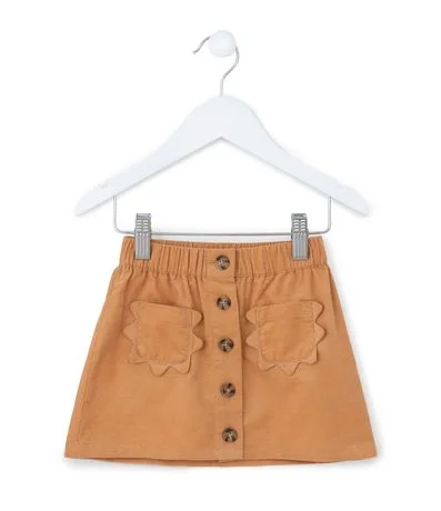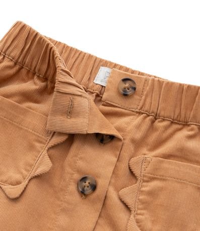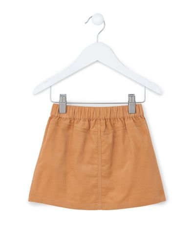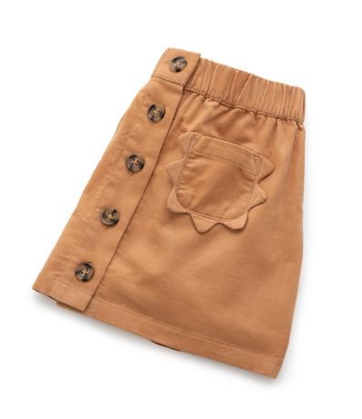 Saia infantil confeccionada em veludo cotelê, com cós elástico, fechamento frontal por botões e bolsinhos.