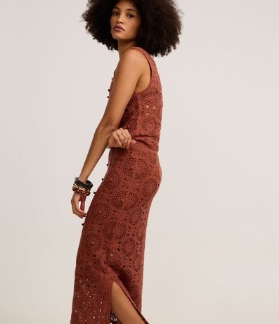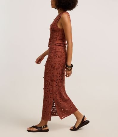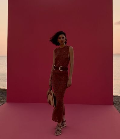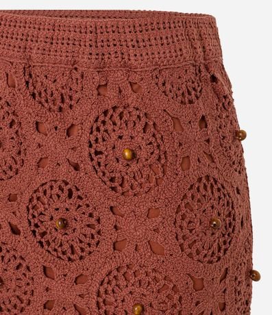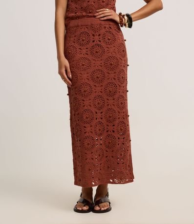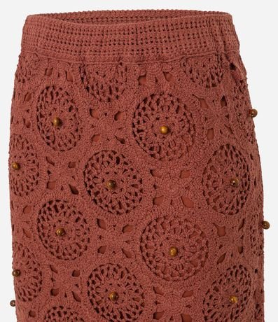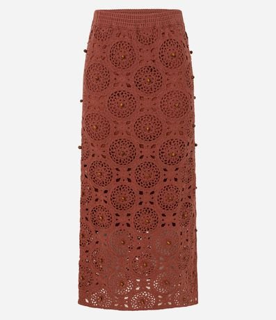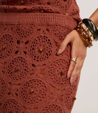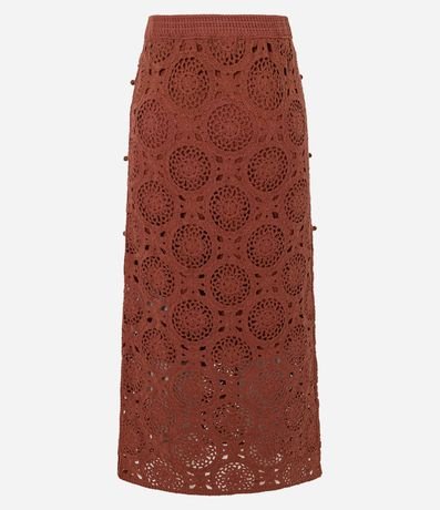 Ref: Saia reta long midi de cintura alta, confeccionada em tricô, com mix de pontos em efeito crochê e miçangas aplicadas. Este produto possui viscose certificada em sua composição, sendo ambientalmente mais responsável.