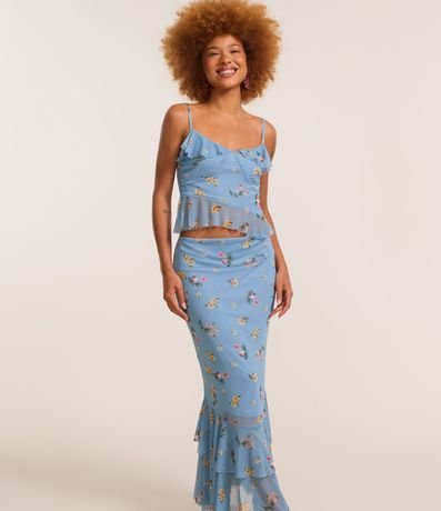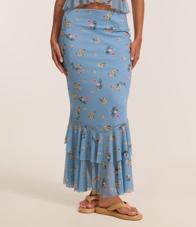 Ref: Saia feminina long midi confeccionada em tule com cós fixo babados na barra e estampa floral liberty.