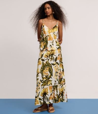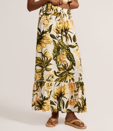 Ref: Saia feminina confeccionada em cambraia mais sustentável, no modelo long midi. Possui cós elástico, com cordão para amarração, babados na barra e estampa de begônias.